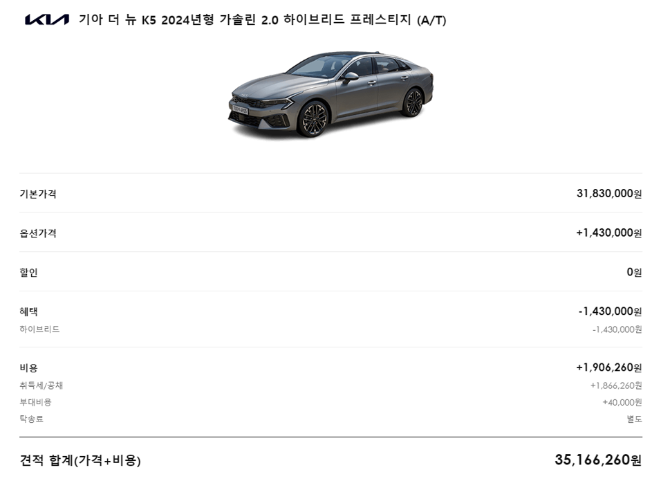차량을 구매할 때 세금이나 옵션 등을 고려해야 실구매가를 추산할 수 있습니다. 아래는 가장 대중적인 옵션과 트림을 선택했을 때 K5 하이브리드 실구매가입니다.