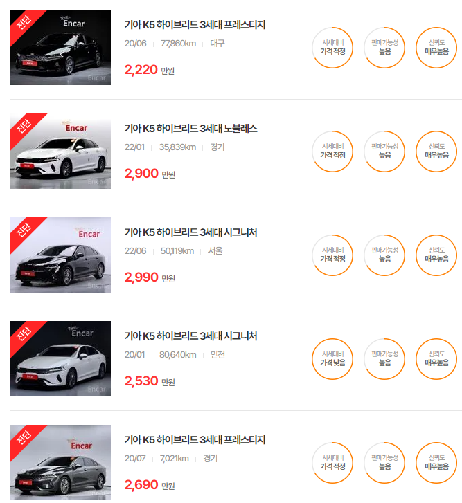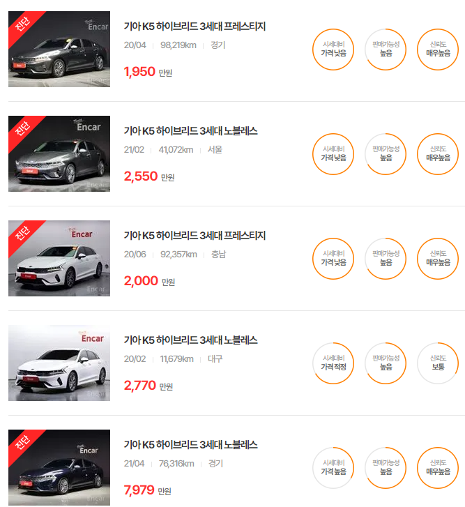 K5 하이브리드 중고차 가격 및 중고차 구매요령