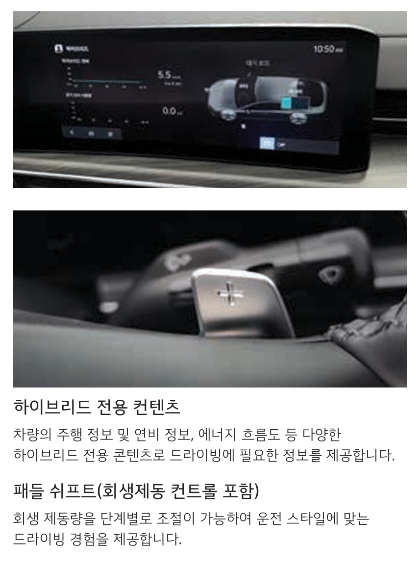 - 친환경: 하이브리드 시스템을 통해 배기가스 배출량을 줄여 친환경적인 운전이 가능합니다.