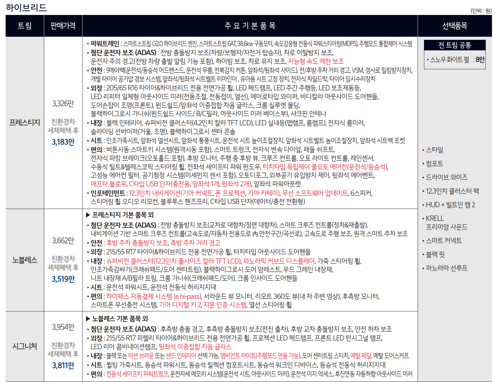 모델별로 k5 하이브리드 가격은 트림별로 프레스티지 3183만 원, 노블레스 3519만 원, 시그니처 3811만 원입니다.