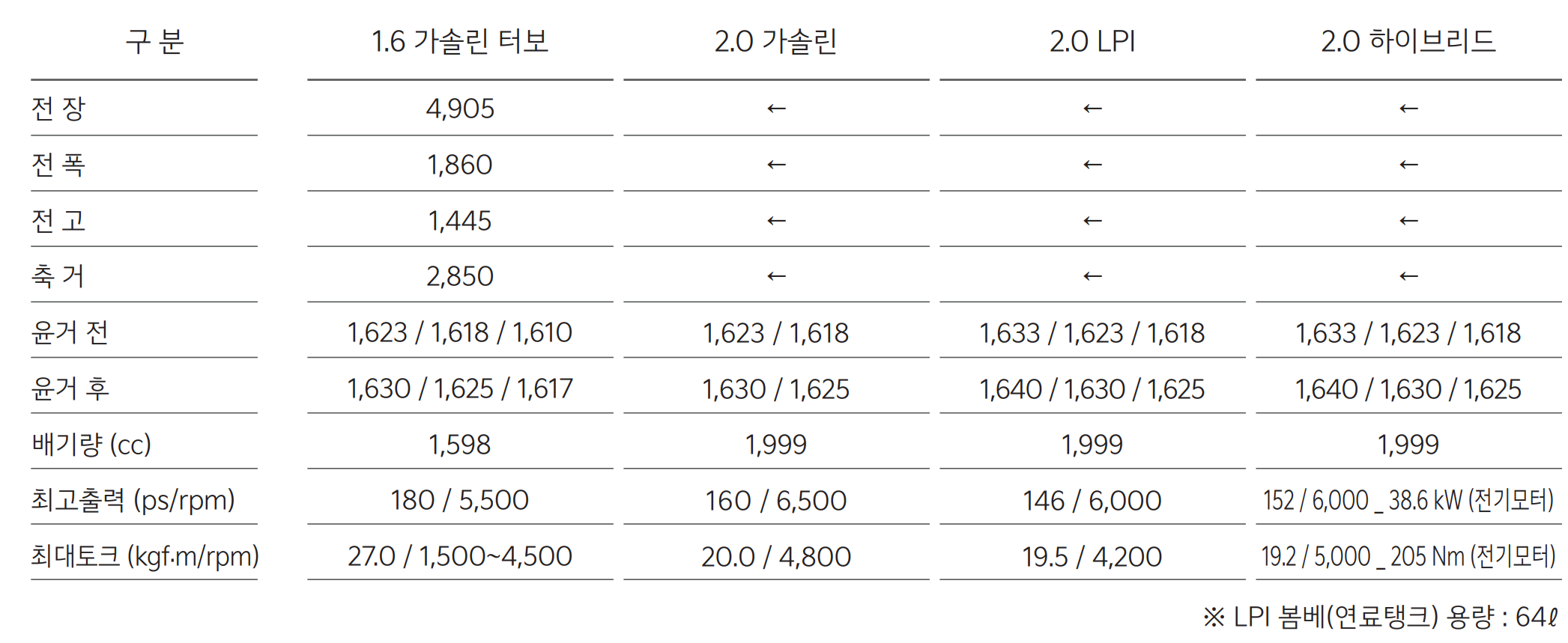 K5 하이브리드의 제원표입니다. 차량의 성능과 크기는 아래와 같습니다.